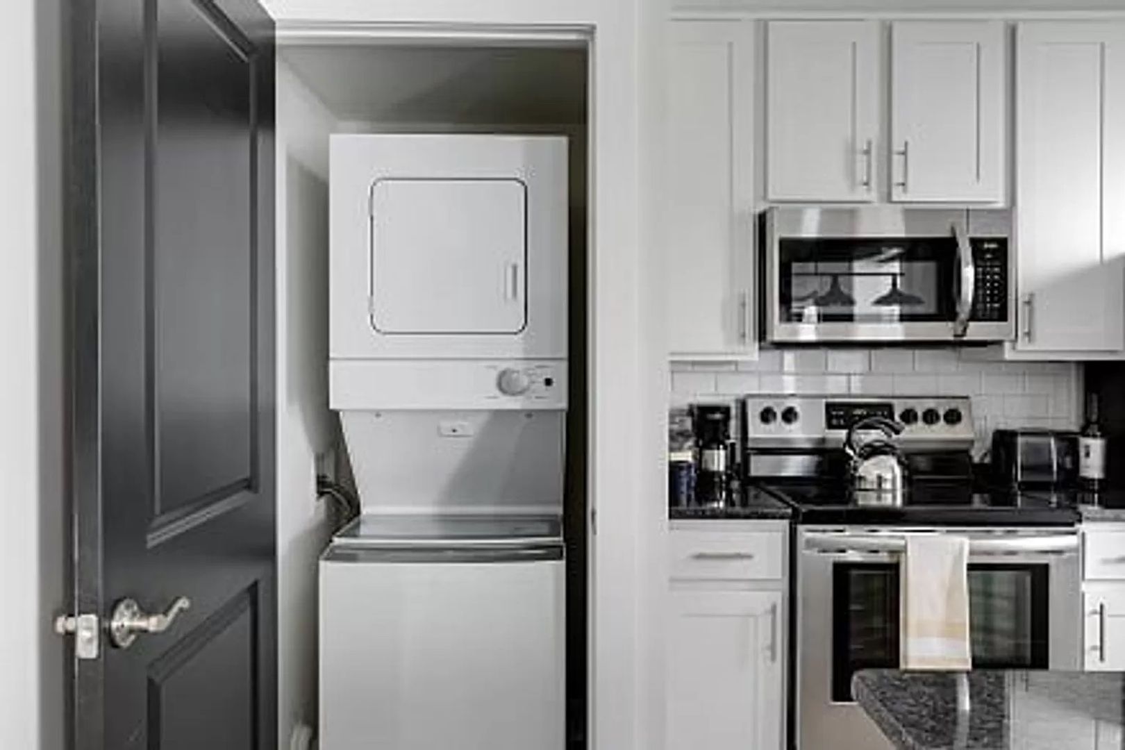 Spacious living room feeds to the kitchen complete with granite countertops, stainless steel appliances, breakfast bar and plenty of cabinet space. Laundry closet with washer and dryer to convey.